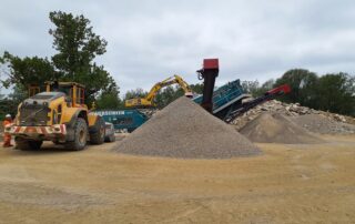 We established sites at two locations in Stanway near Colchester and near Bury St Edmunds to process the waste concrete material from the A12 and A14 respectively. Each site contained integrated crushing and screening facilities with material fed and relocated using excavators and loading shovels.