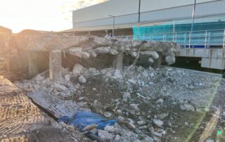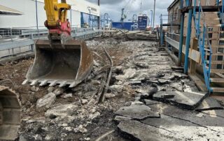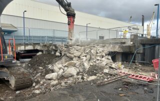 Our works required considerable interface with the busy dock, factories and business in the adjacent industrial trading estate. A jet-wash was employed throughout demolition and loading to suppress dust emissions while noise monitoring was undertaken to ensure we kept to acceptable limits. We received not one complaint during the 5-week project.