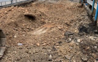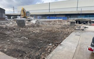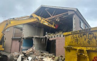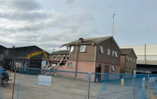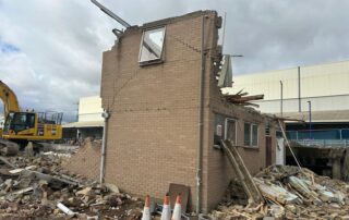 Following this structural demolition of the two-storey buildings, which were constructed from brick walls with a mixture of steel framed roofs and flat wooden roofs, was carried out using a 30-tonne excavator fitted with hydraulic grabs, shears and breaker with a 20-tonne machine cleaning-up. The ground floor slab was excavated and broken-up on-site.