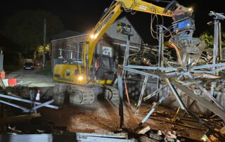 Following strip-out, notifiable asbestos-containing material was removed by our licensed contractor under fully-controlled conditions. Structural demolition was carried out using a 30-tonne excavator fitted with hydraulic attachments. Temporary works to maintain structural stability involved use of ratchet straps anchored to the ground floor slab. Following structural demolition the slab was broken-out using hydraulic breakers.