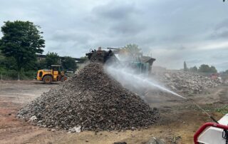 All works were dampened-down using a mist-emitting Dustboss™ machine to maintain air quality while noise monitoring was conducted throughout to ensure levels did not exceed acceptable standards. The works generated over 80 tonnes of wastes which were segregated on-site. Over 3000 tonnes of concrete/hardcore arisings were crushed/processed on site using an impact jaw-crusher with integrated screener to produce 6FN aggregate which was stockpiled and left on-site for use in the build phase. Metals and other waste materials were removed to local waste processing facilities with a 97.2% recycling rate achieved.